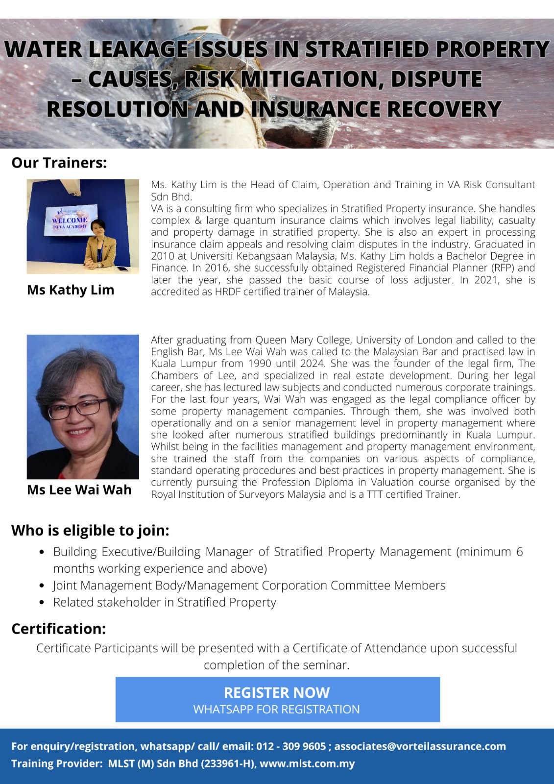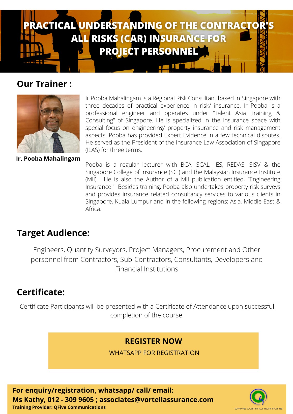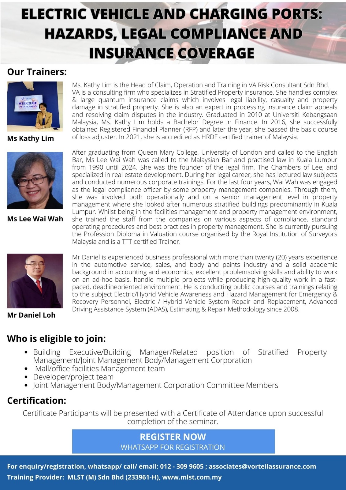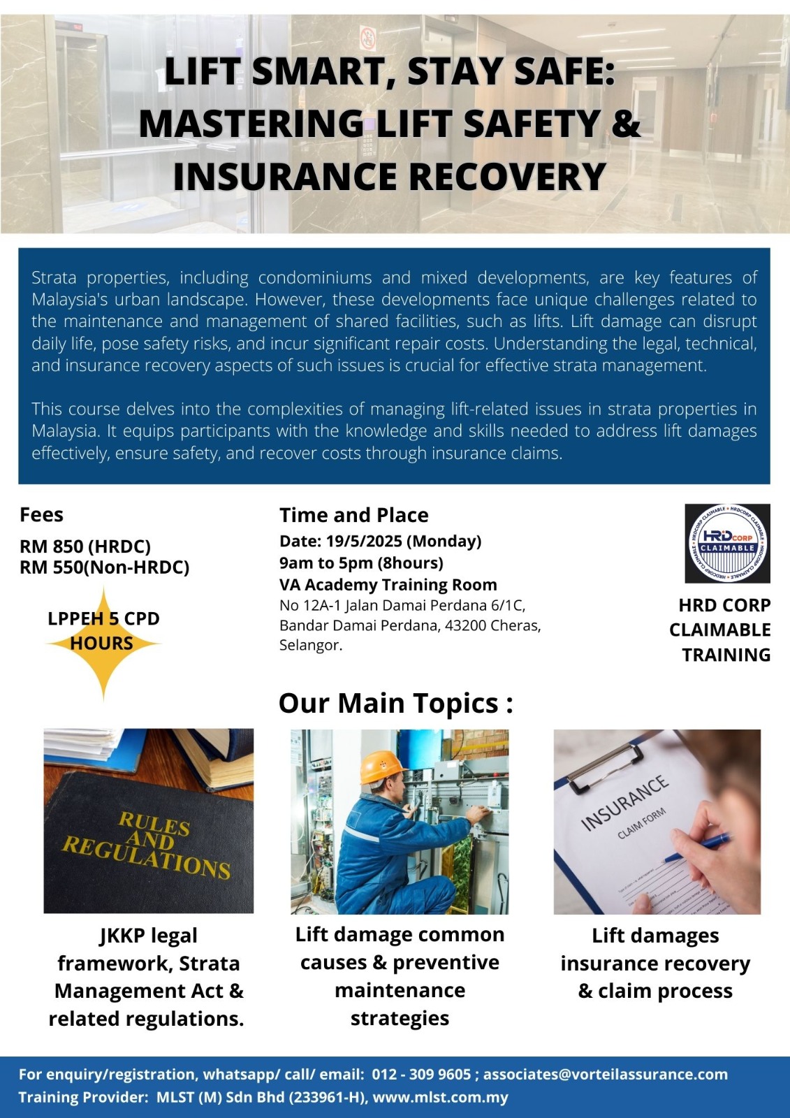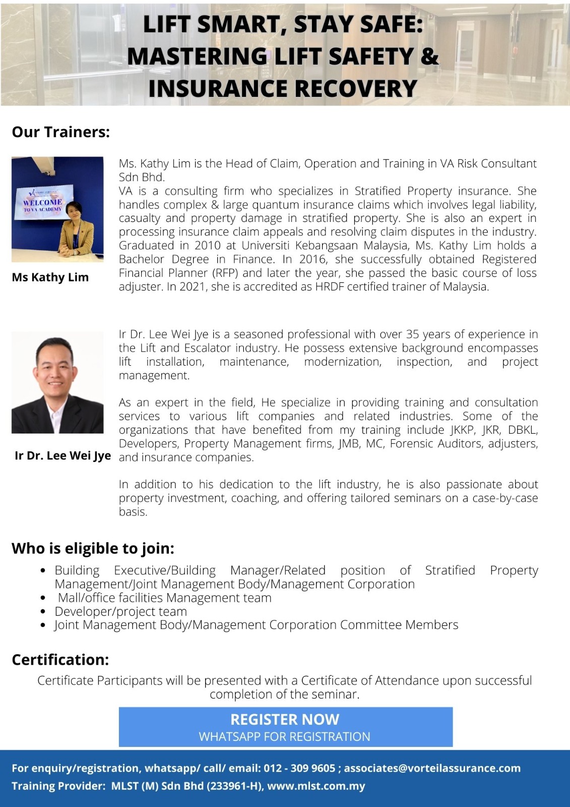 👨🏫 Expert Trainers: Ms. Kathy Lim (Insurance Specialist) & Ir. Dr. Lee Wei Jye (Lift Industry Expert)