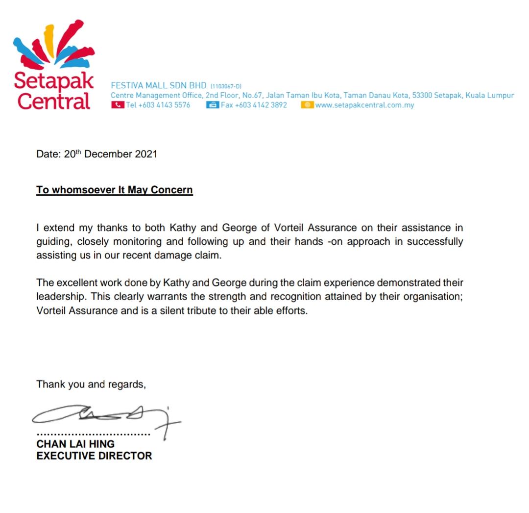 Apart from that, we also received clear information and professional advise from your side. We appreciate your efforts in helping us for the insurance claim and all the related procedures. Also, your kind assistance to fill up the forms for us has reduced our burden in handling works.